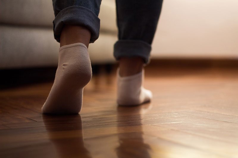 Soft soled slippers with clean bottoms are gentle. Avoid outdoor soles worn indoors.